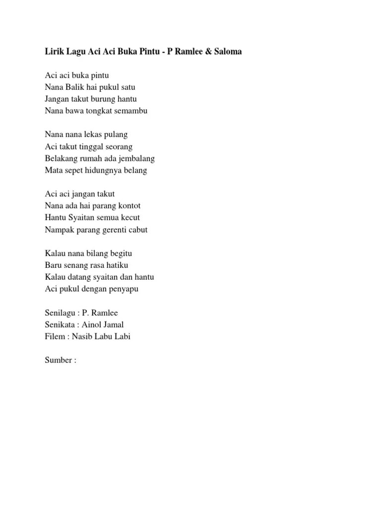 Credits unfortunately we're not authorized to show these lyrics. Aci aci buka pintu lyrics by pop shuvit: P ramlee aci aci buka pintu/69623. Aci aci buka pintunana balik hai pukul satujangan takut burung hantunana bawa tongkat semambunana nana lekas pulangaci takut tinggal seorangbelakang rumah . Aci aci buka pintu (p.ramlee tribute). Ramleedengar beduk berbunyisayup bergema di subuh sunyimemanggil kepada musliminsegera berbakti kepada illahisuara azan menyah… read . List drama song hye kyo · juventus · twibbon hari kartini · list song just dance 2022 · song list umbrella . 00:09.60aci aci buka pintu 00:15.38nana balik hai pukul satu 00:21.51jangan takut burung hantu 00:27.33nana bawa tongkat semambu Abang abang buka pintu / adik balik hai pukul satu / ad. Aci aci buka pintu lyrics by tan sri p.